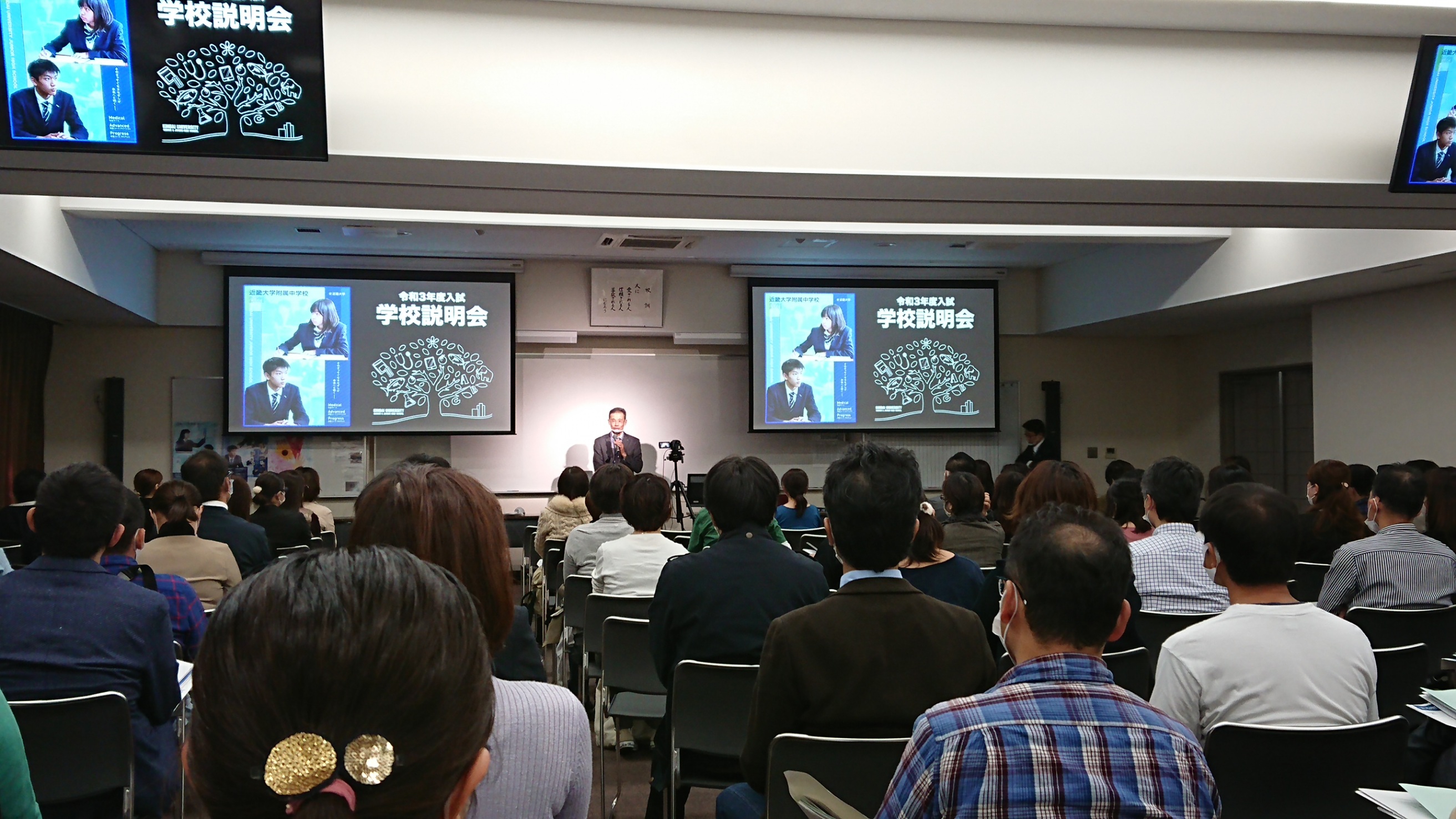 近年高い人気を誇る近畿大学の附属校ということで注目度の高い学校ですが、本年度の説明会は会場の密を避けるため150組限定での募集に加え、会場には一家族1名のみの入場という制限がありましたので、一緒に来校された方(約50名)は食堂にてライブ配信を視聴できるよう工夫されていました。併せて家庭へのライブ配信も行い100組の参加があったようです。生徒の6割は近畿大学へ進学するものの2割は国公立または医歯薬系を含む難関私立大へ進学するという、大学附属校と進学校の融合を目指したハイブリッド型一貫校という位置付けで、3つのコース(医薬コース・英数コースアドバンスト・英数コースプログレス)それぞれの特徴が明確です。コース変更も4年進級時まで可能としており、成長とともに変わる方向性に広く対応できるところも大きな特色であります。早い時期(2014年)から一人1台のiPadを導入していることで今年の休校中でも「学びを止めない」を実現できたことや、大学との連携教育によるさまざまな体験実習を受けられることに魅力を感じました。